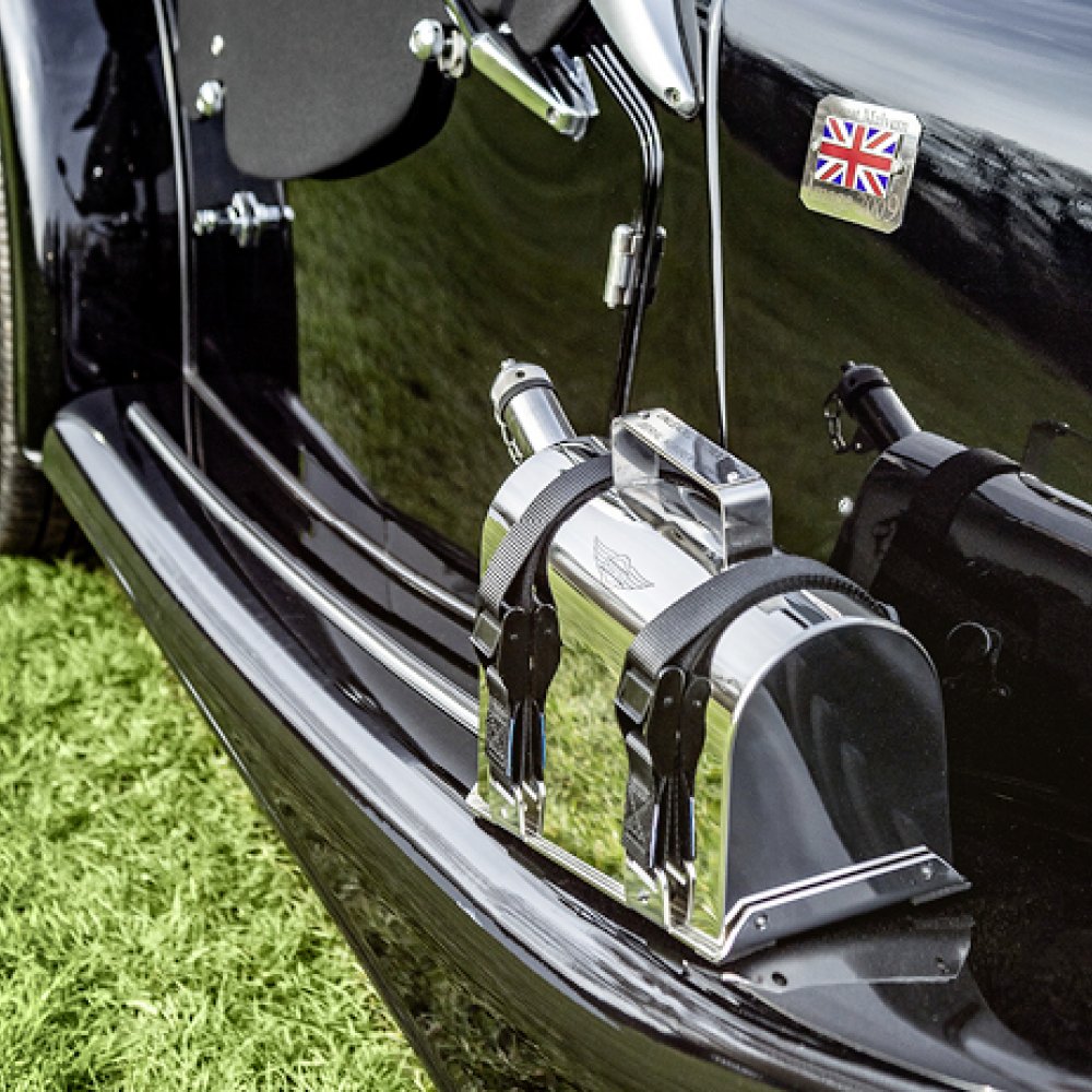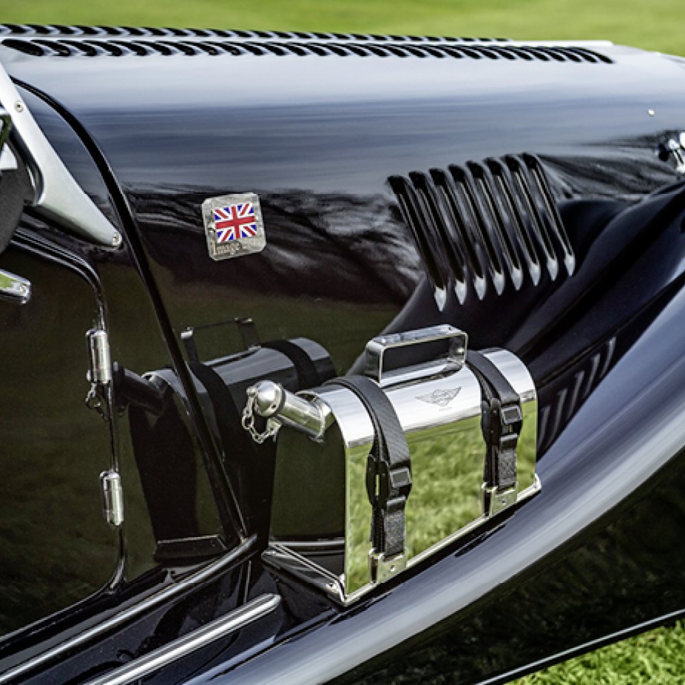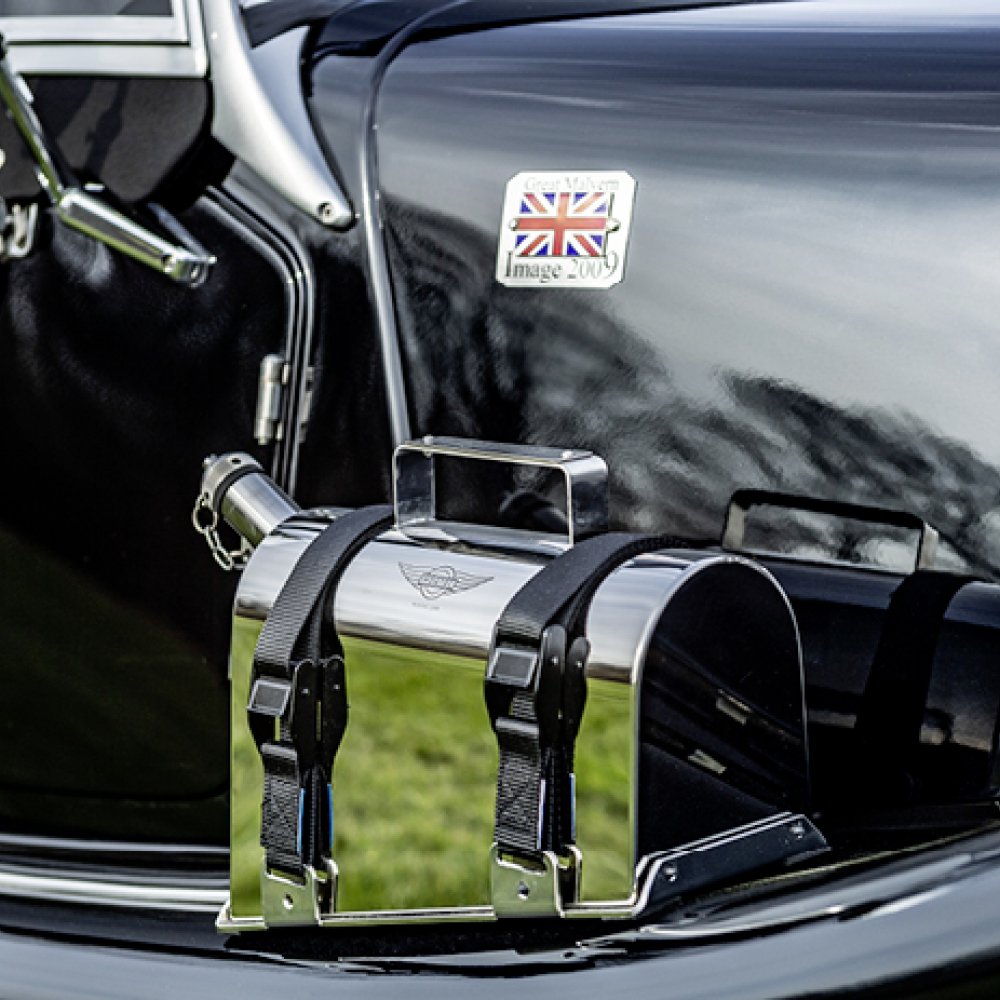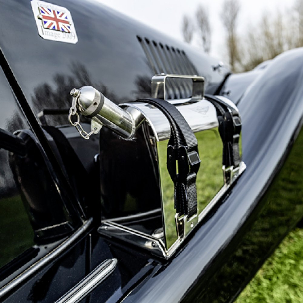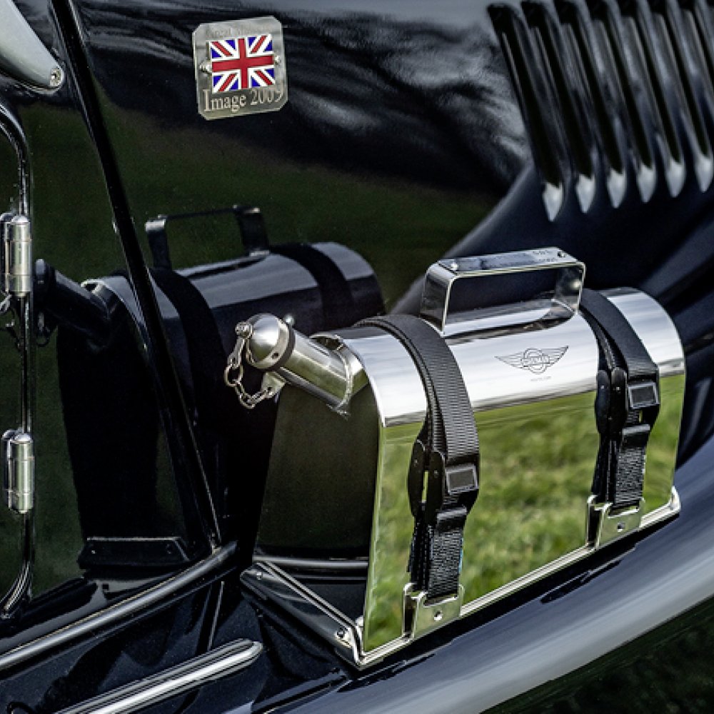 Und wir? Zwinkern unserem Fünf-Liter-Reservekanister aus 1,5 mm dickem Qualitäts-Edelstahl auf dem Trittbrett dankbar zu. Sauber geschweißt, geschliffen, poliert, funkelt er in der Sonne Worcestershires. Wir sind froh. Froh, dass keine handelsübliche, stinkende Plastikkanne in unseren Wagen passt, weder stilistisch noch vom Platz her. Froh, dass wir seit Generationen wissen, wo der beste Platz für einen Kanister ist, gut gesichert mit zwei schwarzen Gewebegurten und 3 mm Qualitätsedelstahl – auf dem schwungvollen Kotflügel unseres Morgan. So freuen wir uns, dass uns Beete von Malven grüßen wo keine Tankstelle ist, die wir nicht brauchen. Tippen aufs Gas. Weiter, immer weiter.
