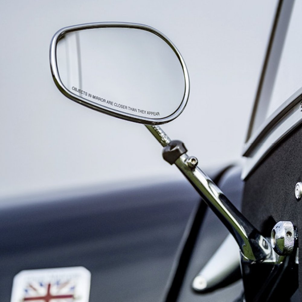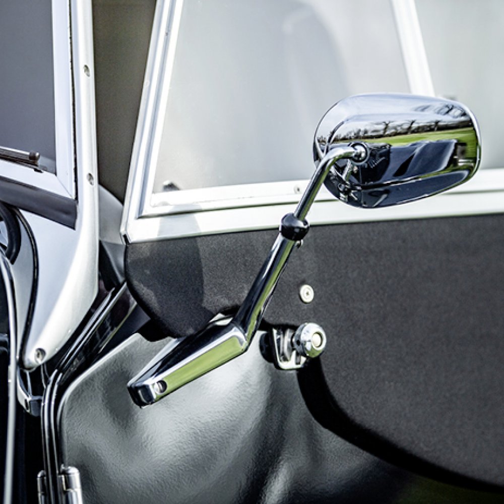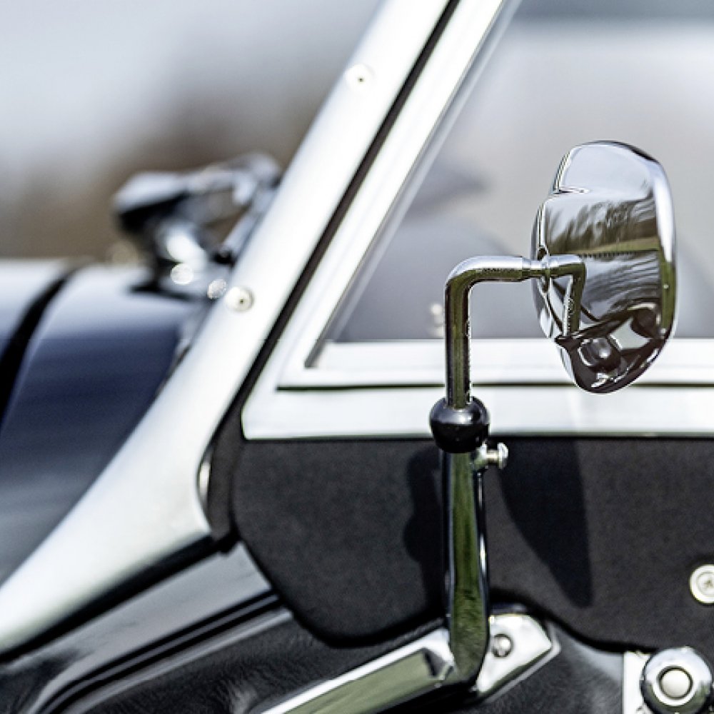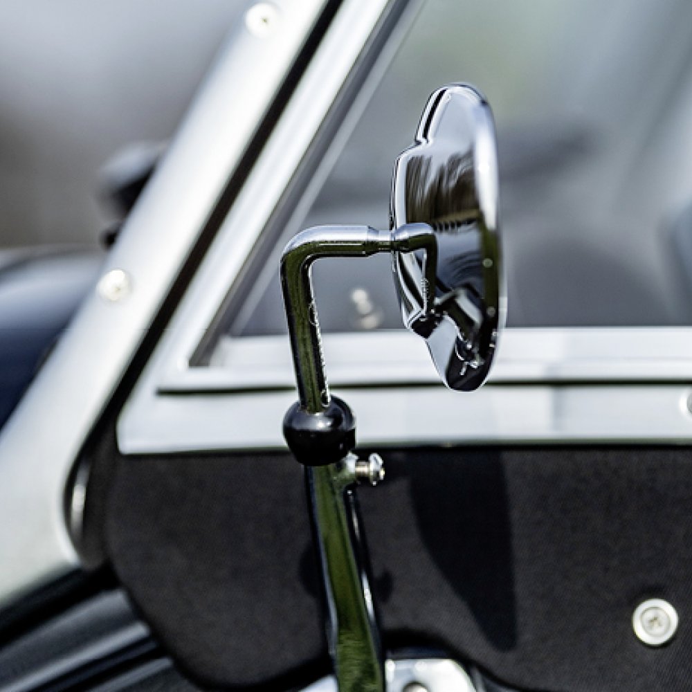 Ein leichtes Tippen aufs Gaspedal reicht manchmal aus, um alle anderen im Rückspiegel schnell ganz klein werden zu lassen. Meist sind sie dann so klein, dass sie im original Außenspiegel unseres Morgan noch gut zu erkennen sind. Wollen wir aber einmal die fantastische Landschaft hinter uns mit einem kurzen Blick in den Rückspiegel in ihrer epischen Breite bewundern, reicht das Sichtfeld des Originals nicht mehr aus. Darum haben wir unseren eigenen Außenspiegel entwickelt. Die gesamte, hundertjährige Lindenallee sollte schon in ihrer ganzen Pracht hineinpassen, also haben wir dem Spiegelglas die perfekte konvexe Wölbung für ein breites Sichtfeld gegeben. Und weil wir nicht nur der Sonne entgegenfahren, sondern gerne einmal den Sonnenuntergang rückblickend betrachten, haben wir das Glas gerade so leicht getönt, dass es nicht mehr blendet. Was sollen wir sagen: Unser Außenspiegel passt nicht nur perfekt in die Original-Halterung links wie rechts. Er sieht, bei allem angebrachten britischen Understatement, auch noch besser aus als das Original.
